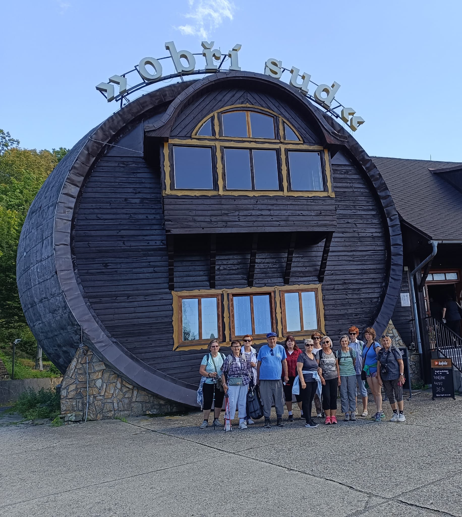Ve středu dne 3.9.2025 odjelo celkem 13 turistů KČT Poděbrady vlakem Arriva přes Liberec a dále autobusem k Obřímu sudu, kam jsme přijeli v době obědů. Obří sud je výletní restaurace z roku 1931, dosahuje výšky 11,50 m, délky 14,15 m, šířky 10,50 m a celý je ze dřeva.