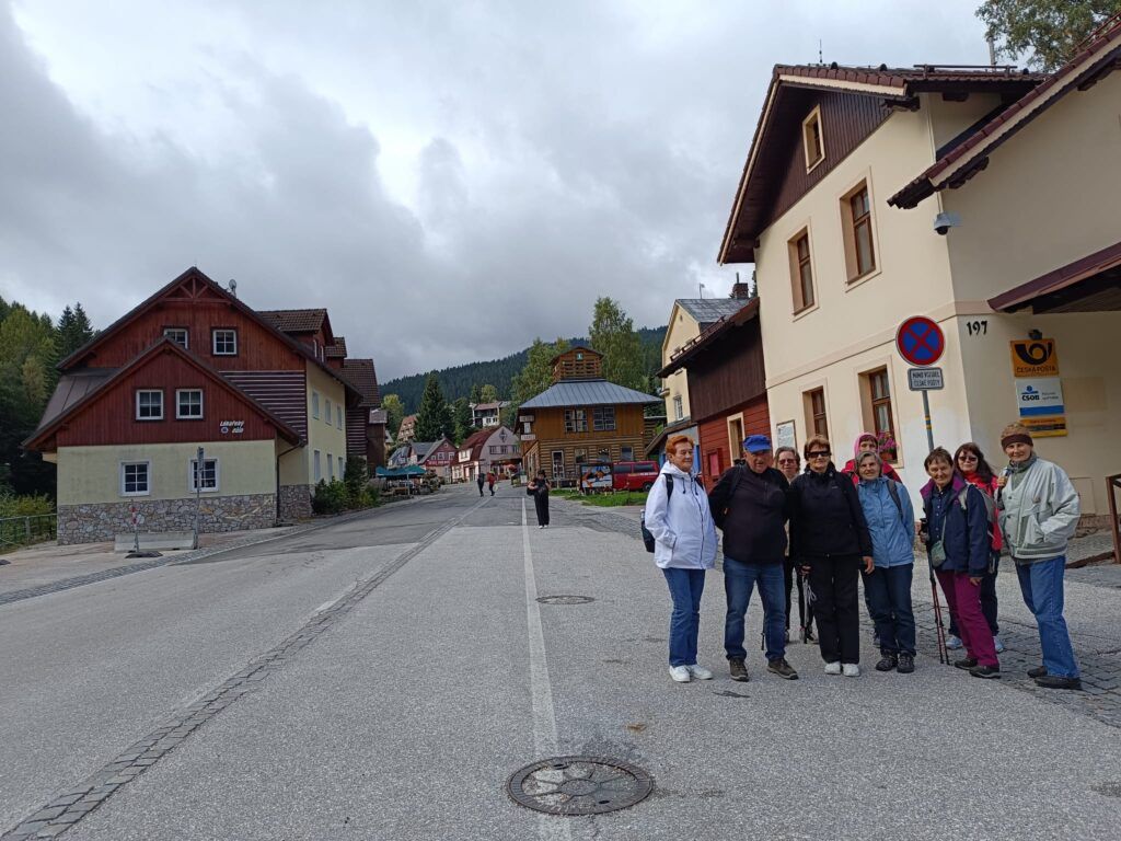 Ve středu dne 17. září 2025 jelo 11 členů našeho odboru na výlet do Krkonoš. Při příchodu na nástupiště měl náš vlak uveden včasný odjezd, potom se však na odjezdové tabuli objevovalo postupně zpoždění až o 20 minut. Ve vlaku jsme požádali průvodčí, aby přes dispečera zařídila v Hradci Králové čekání přípoje do Svobody nad Úpou. Povedlo se jí to až napotřetí, jinak by plánovaný výlet byl zmařený. Do Pece jsme nakonec dorazili podle časového plánu.