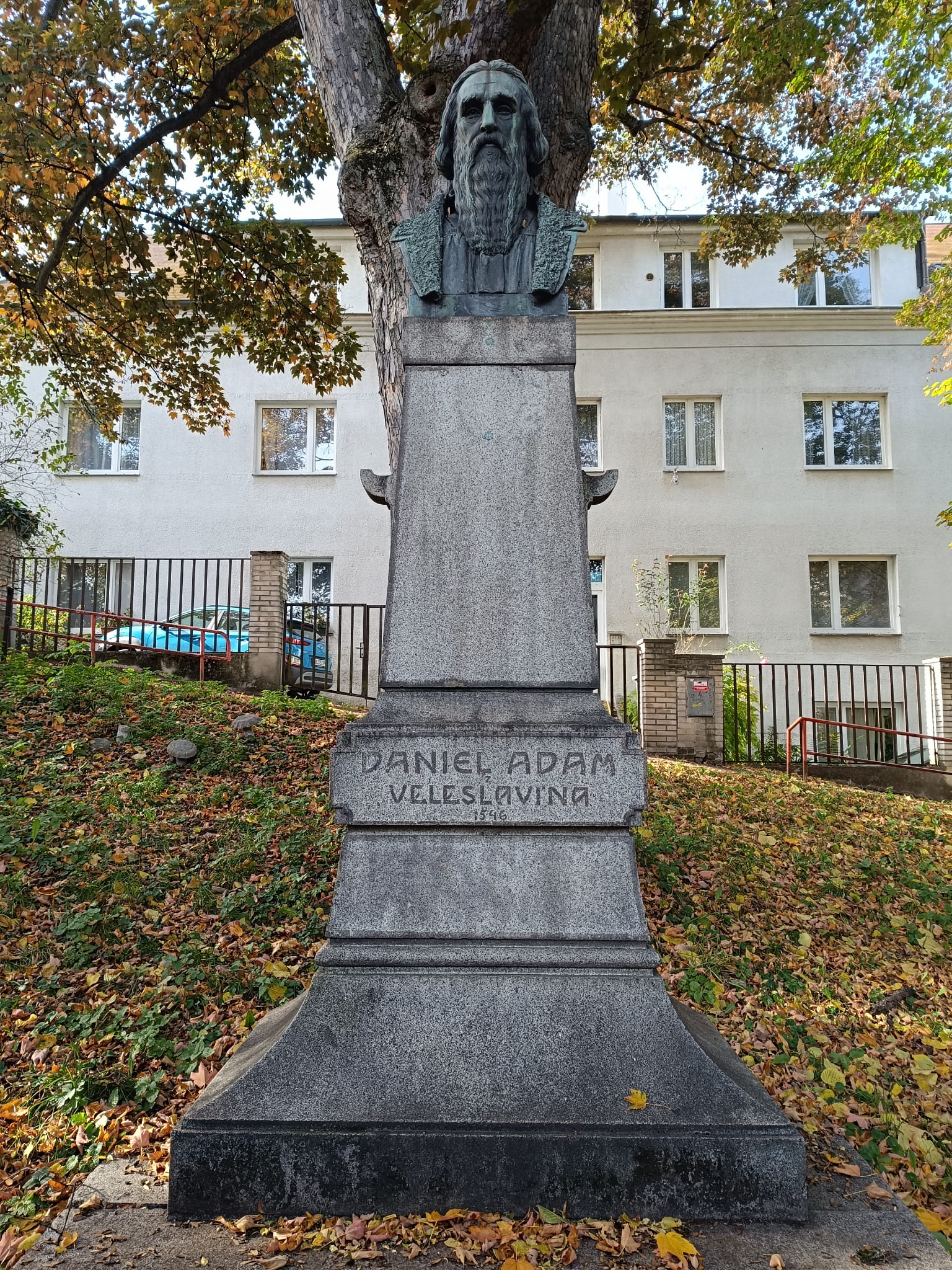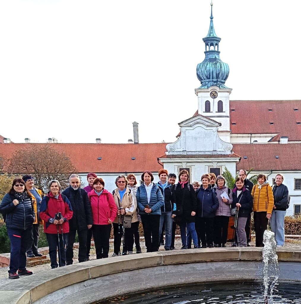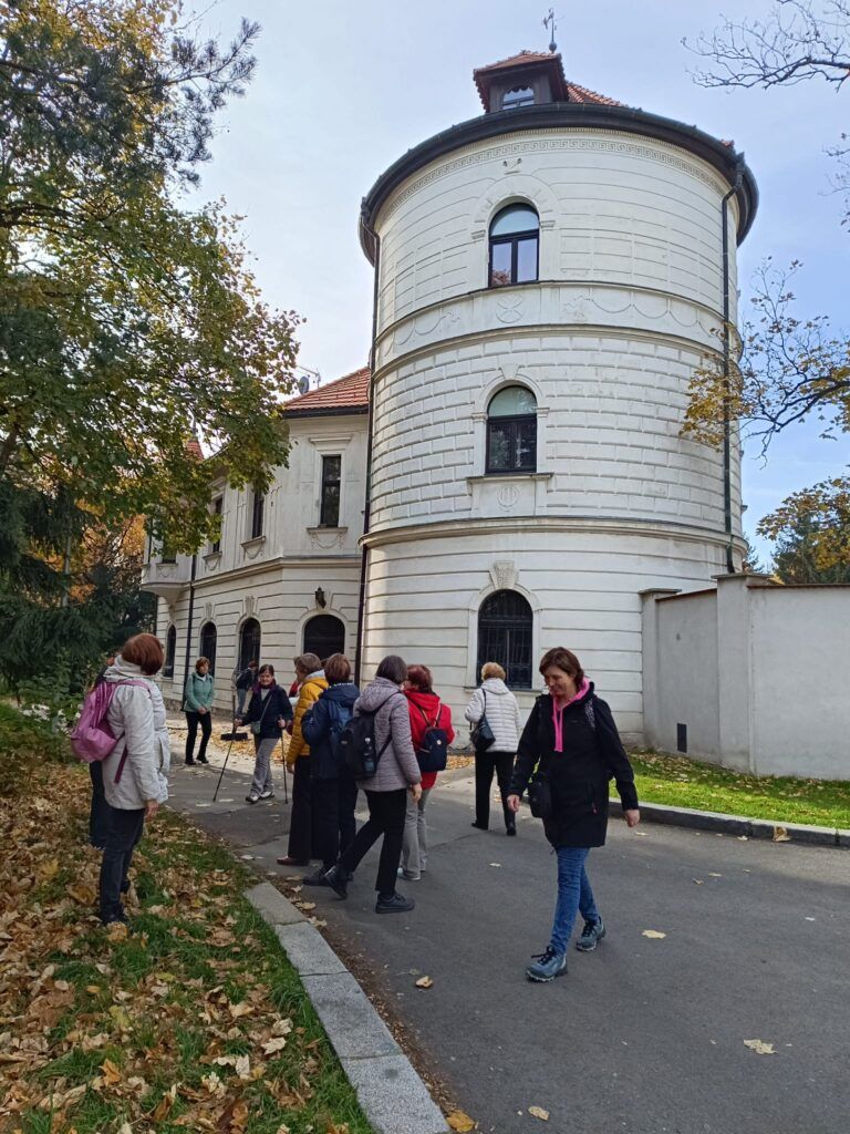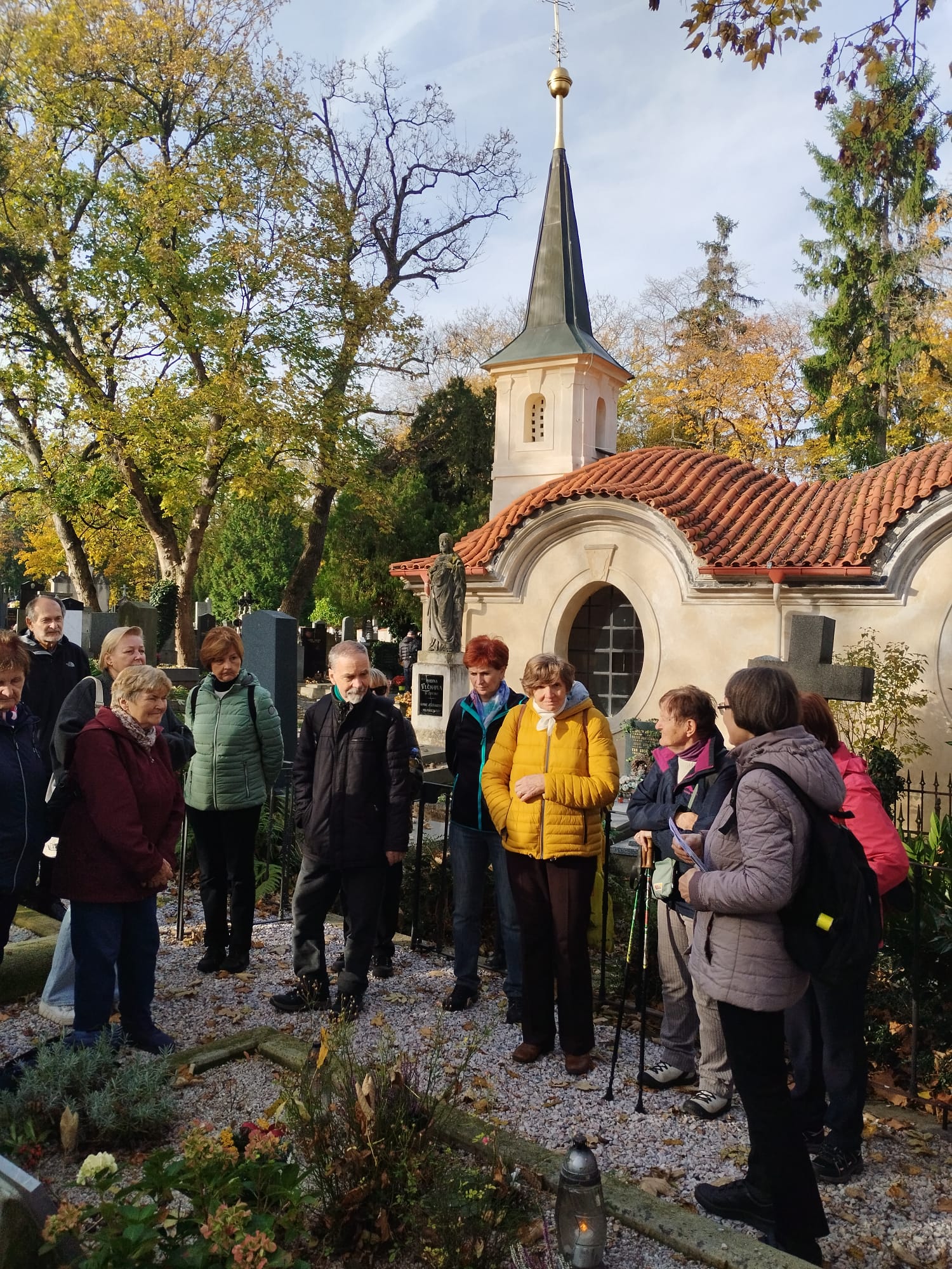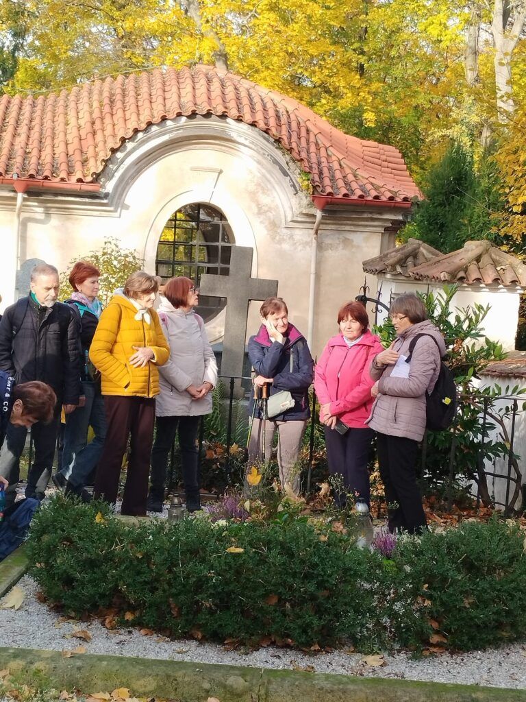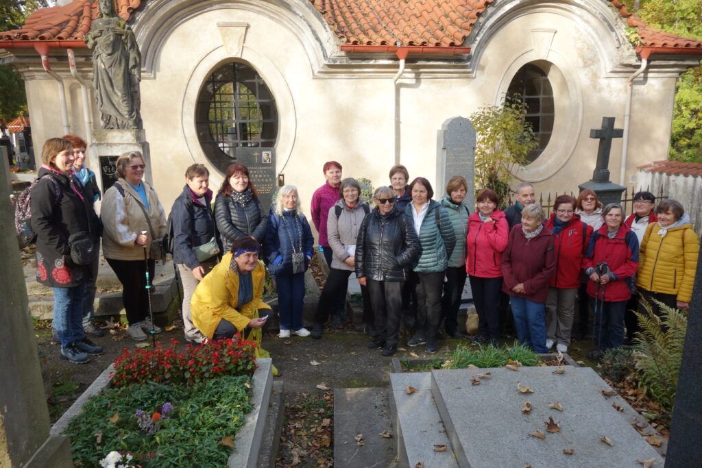 Vycházky z Veleslavína na břevnovský hřbitov se v sobotu 1. listopadu zúčastnilo 17 členů našeho odboru a šest hostů. Nejprve jsme se cestou zastavili u pomníku významného humanistického knihtiskaře Daniela Adama z Veleslavína. Ve stejném parčíku jsme si vyfotografovali drobnou kamennou stavbu ze 16. století, která sloužila k údržbě hradního vodovodu. Pražský hrad byl po staletí zásobován vodou z oblasti Veleslavína a jeho okolí 6 km dlouhým vodovodem.