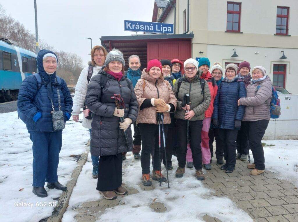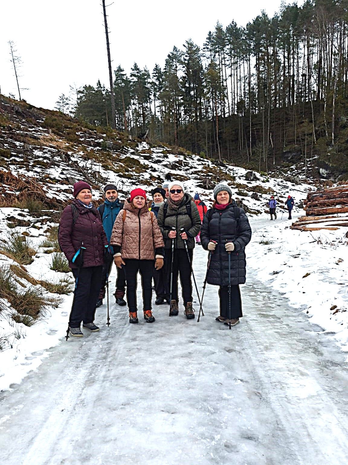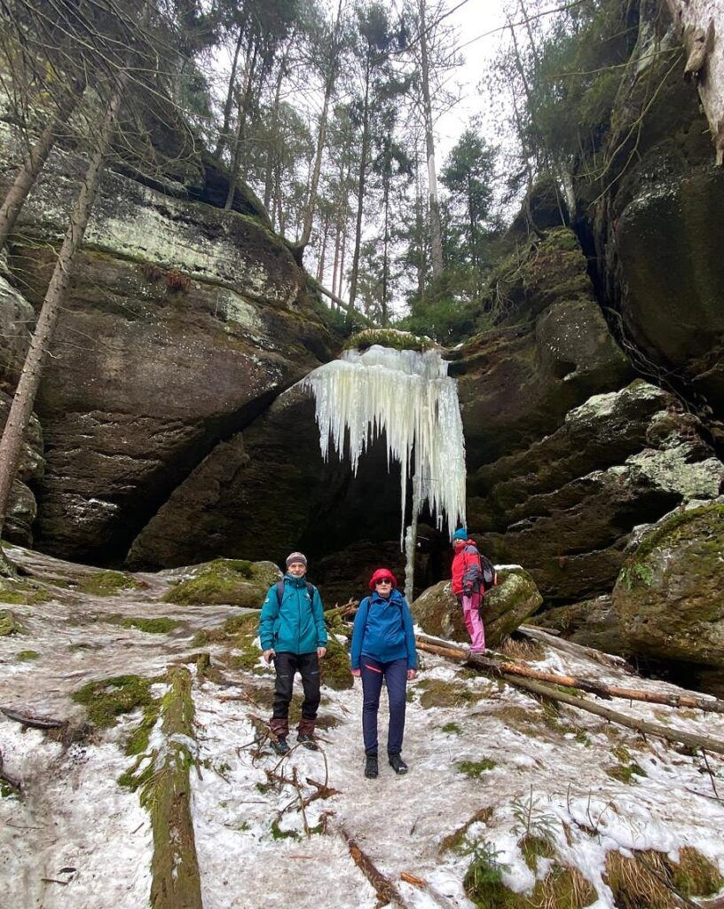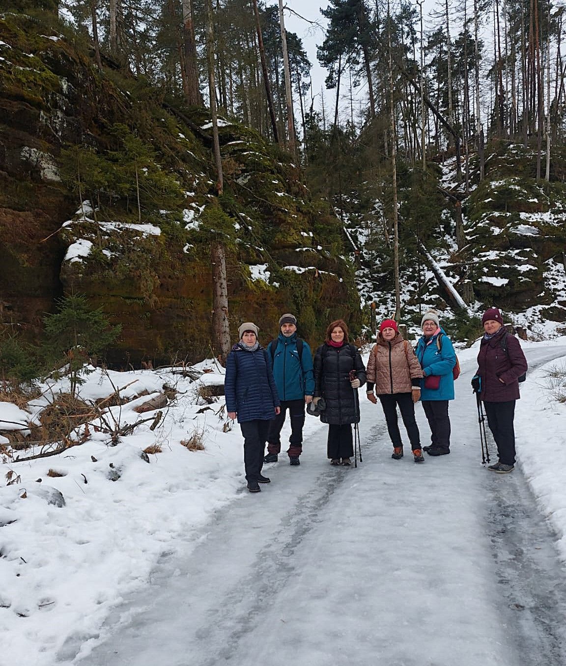 V sobotu 7.2.2026 jelo 13 turistek a 1 turista na Brtnické ledopády. Do Krásné Lípy jsme přijeli v půl jedenácté. Došli jsme na náměstí, odkud nám jel v 11 hodin autobus do Vlčí hory. Příjemný řidič nás dovezl až na Vlčí potok – U Nevrlého jezevce. Pak jsme se vydali za ledopády. Počasí bylo teplé a sníh tál a přimrzal. Hodně z nás mělo nesmeky. Ledopády pomalu tály, ale pár jsme jich viděli. Někteří šli na Varhany a přešli Velký ledový sloup. Ostatní navštívili oba dva. Posvačili jsme u Turistického mostu a dál šli do Kyjovského údolí. Jeskyně víl už byla bez rampouchů a tak jsme šli dál kolem říčky Křinice. Kinského vyhlídka byla bez sněhu. Kyjov a Dixův mlýn jsme přešli a zastavili se v restauraci Na Fakultě a dále v bistru na polévce. Autobusem jsme jeli do Rybniště a na nádraží se podívali, v kolik nám to jede. Měli jsme čas a tak jsme ještě došli na večeři. Nachodili jsme 12 km a ve 20 hodin jsme přijeli do Poděbrad.