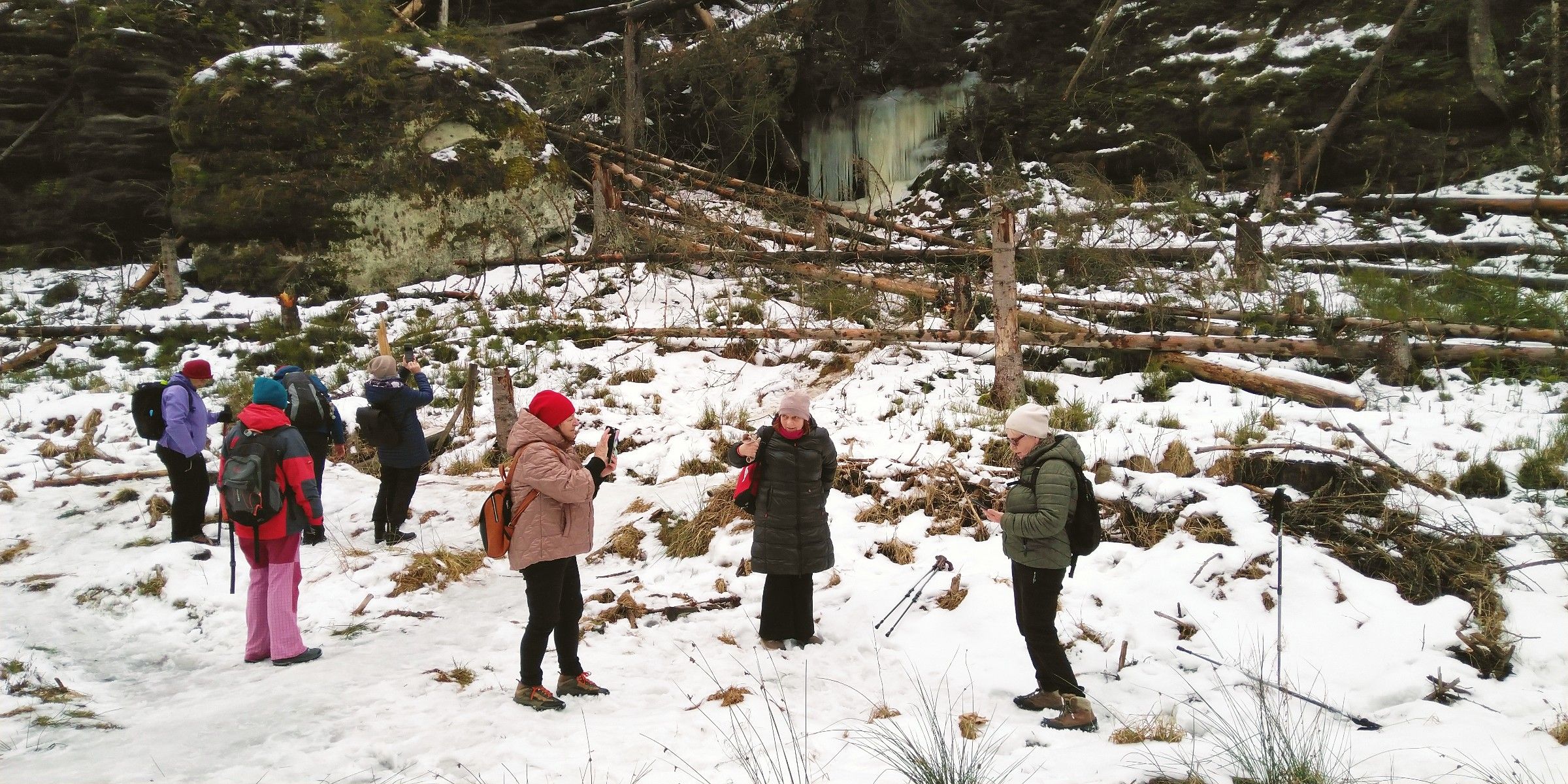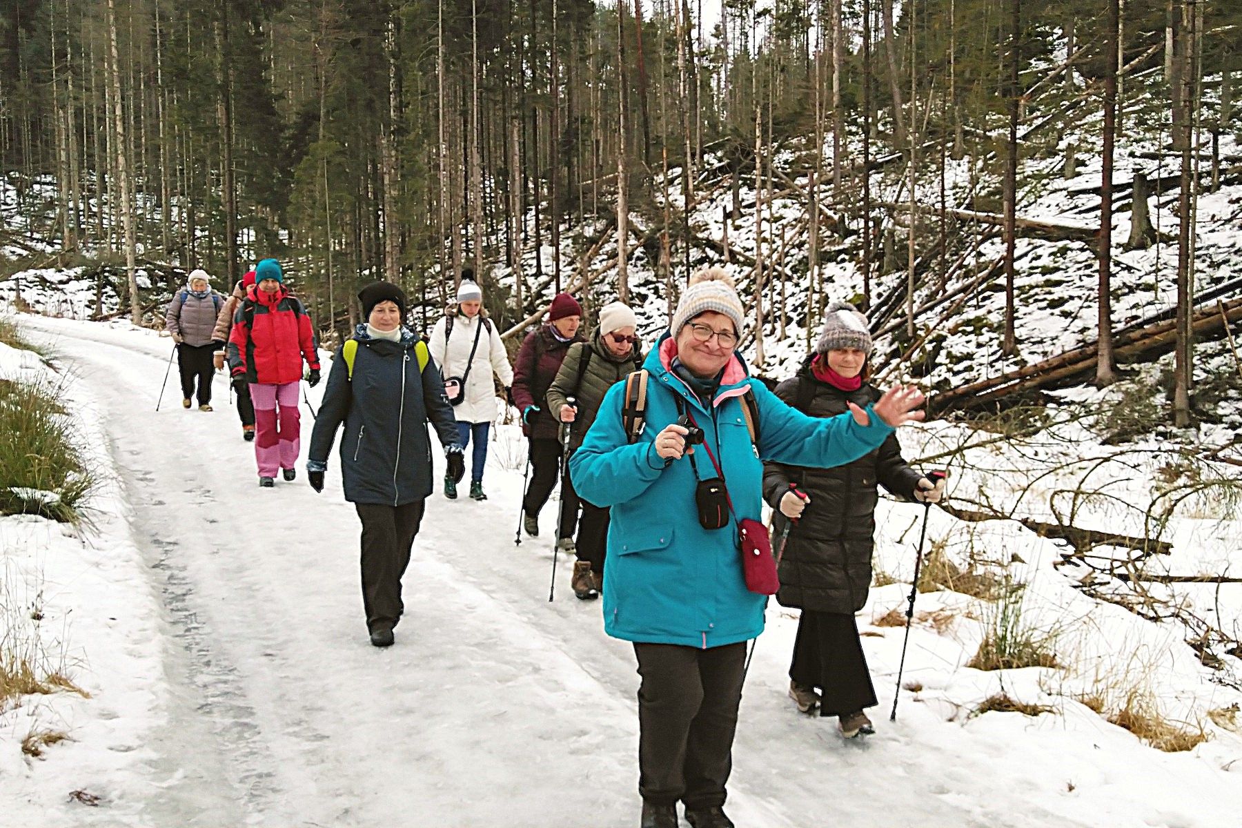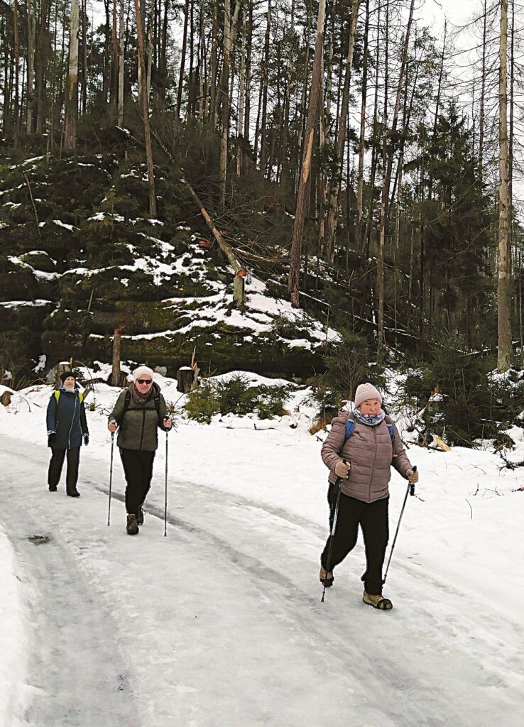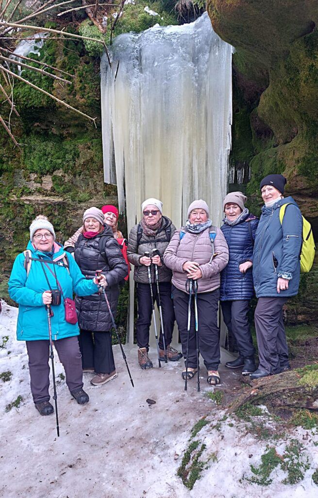V sobotu 7.2.2026 jelo 13 turistek a 1 turista na Brtnické ledopády. Do Krásné Lípy jsme přijeli v půl jedenácté. Došli jsme na náměstí, odkud nám jel v 11 hodin autobus do Vlčí hory. Příjemný řidič nás dovezl až na Vlčí potok – U Nevrlého jezevce. Pak jsme se vydali za ledopády. Počasí bylo teplé a sníh tál a přimrzal. Hodně z nás mělo nesmeky. Ledopády pomalu tály, ale pár jsme jich viděli. Někteří šli na Varhany a přešli Velký ledový sloup. Ostatní navštívili oba dva. Posvačili jsme u Turistického mostu a dál šli do Kyjovského údolí. Jeskyně víl už byla bez rampouchů a tak jsme šli dál kolem říčky Křinice. Kinského vyhlídka byla bez sněhu. Kyjov a Dixův mlýn jsme přešli a zastavili se v restauraci Na Fakultě a dále v bistru na polévce. Autobusem jsme jeli do Rybniště a na nádraží se podívali, v kolik nám to jede. Měli jsme čas a tak jsme ještě došli na večeři. Nachodili jsme 12 km a ve 20 hodin jsme přijeli do Poděbrad.